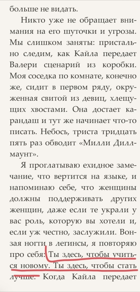 Сам роман неплохой. К финалу, когда все три героини осмелели и заявили о своих желаниях, стало напоминать подростковые бредни из серии "Вы, взрослые, дурачки глупые, а мы всё можем и всё знаем". На этом всё и обрывается.