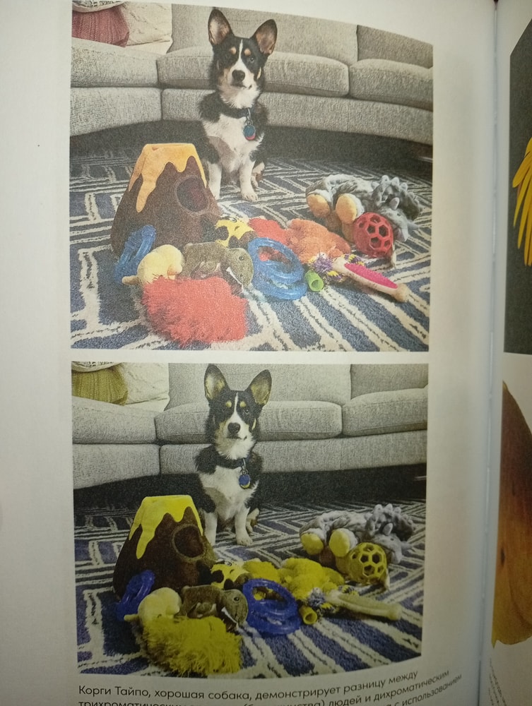 Эд Йонг "Необъятный мир". Книга - неожиданный и очень приятный подарок к началу учебного года от Оли из Подольска, поэтому к книге особо нежное отношение. Но даже не смотря на это книга очень хорошая. Автор рассказывает о том, как ощущают окружающий мир разные животные. Как они видят, слышат, ощущают запахи, вкусы. Очень много интересных фактов. Например, собаки все-таки различают цвета. Только они видят цвета немного в иной гамме. Вот для примера фото - сверху то, как видим мы, снизу - как видят собаки: