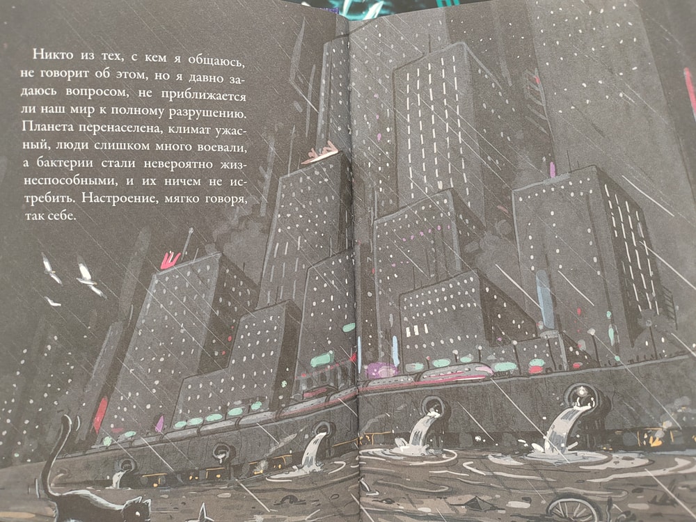 Книга замечательно сделана - огромную часть удовольствия от прочтения обеспечивают оформление и иллюстрации. Их много и они цветные, на целый разворот и наполовину, есть целые развороты с иллюстрациями без текста, есть развороты с двумя-тремя словами, и есть, конечно, развороты без иллюстраций, все-таки это текстовая книга, не книга-картинка. Автор писал книгу в соавторстве с Бьерном Сортландом, а за иллюстрации отвечал Паси Питкянен. Текст и рисунки здесь неразделимы и работают вместе, и делают это суперски.