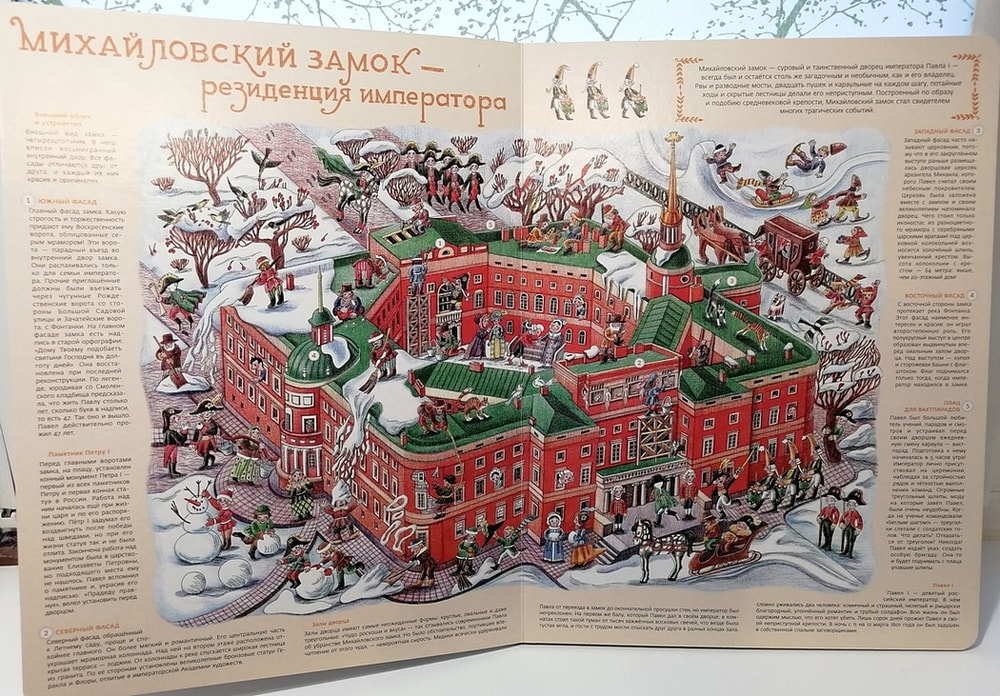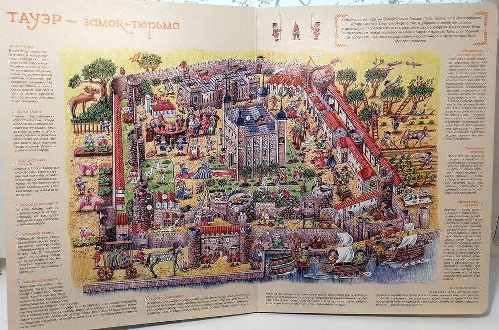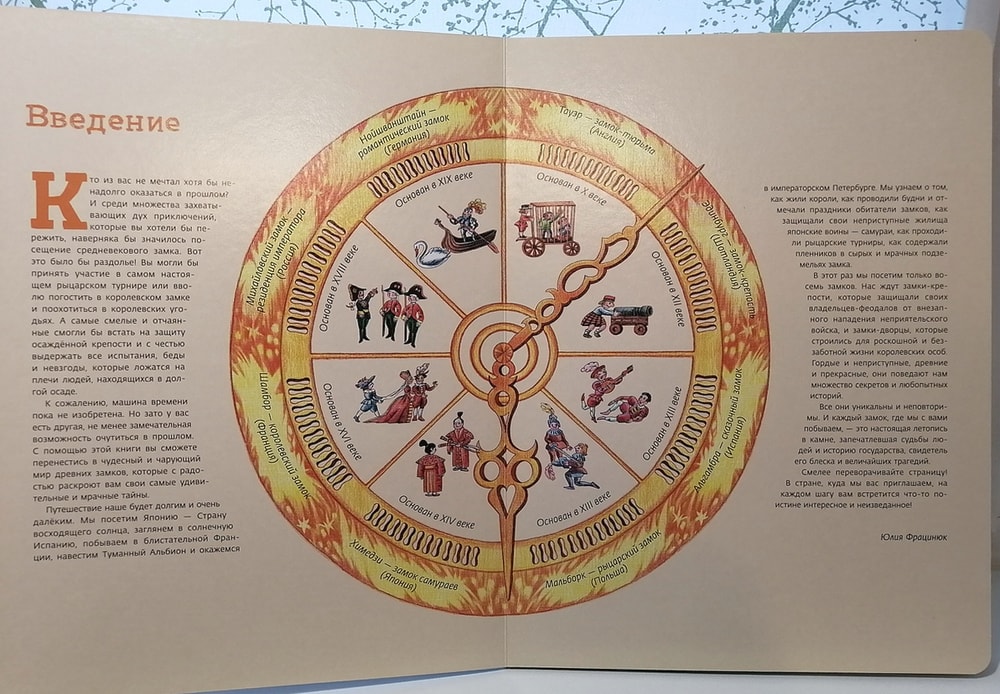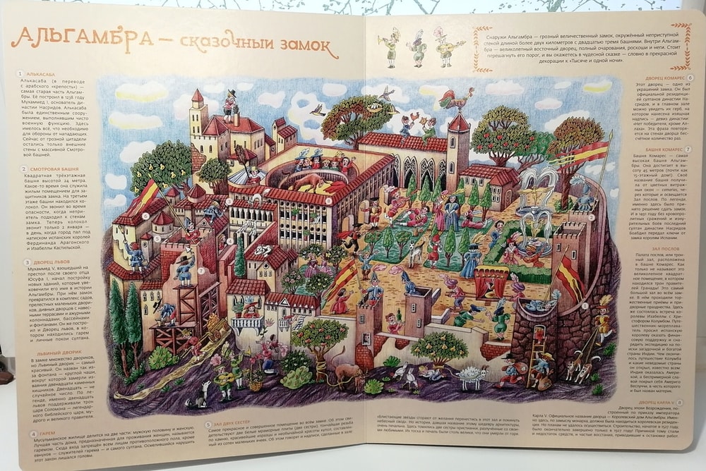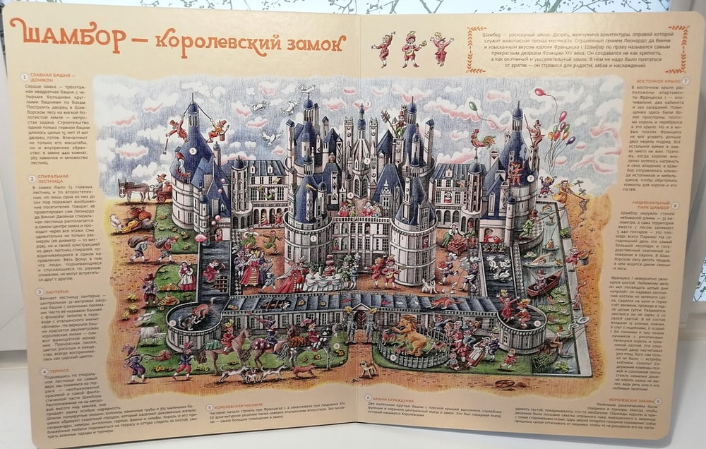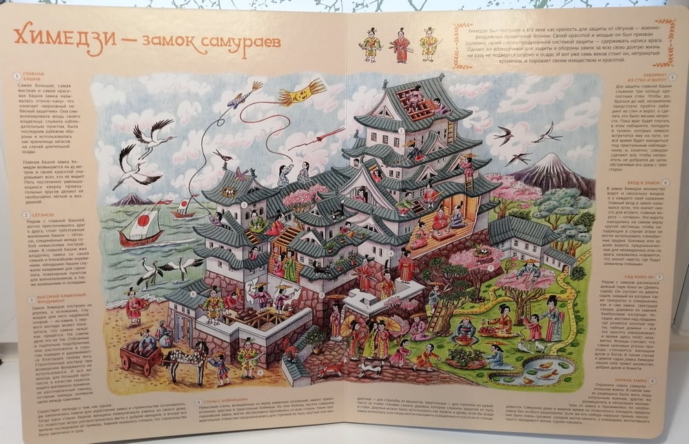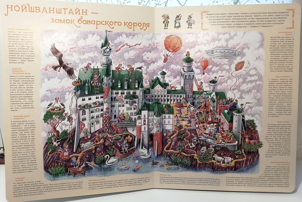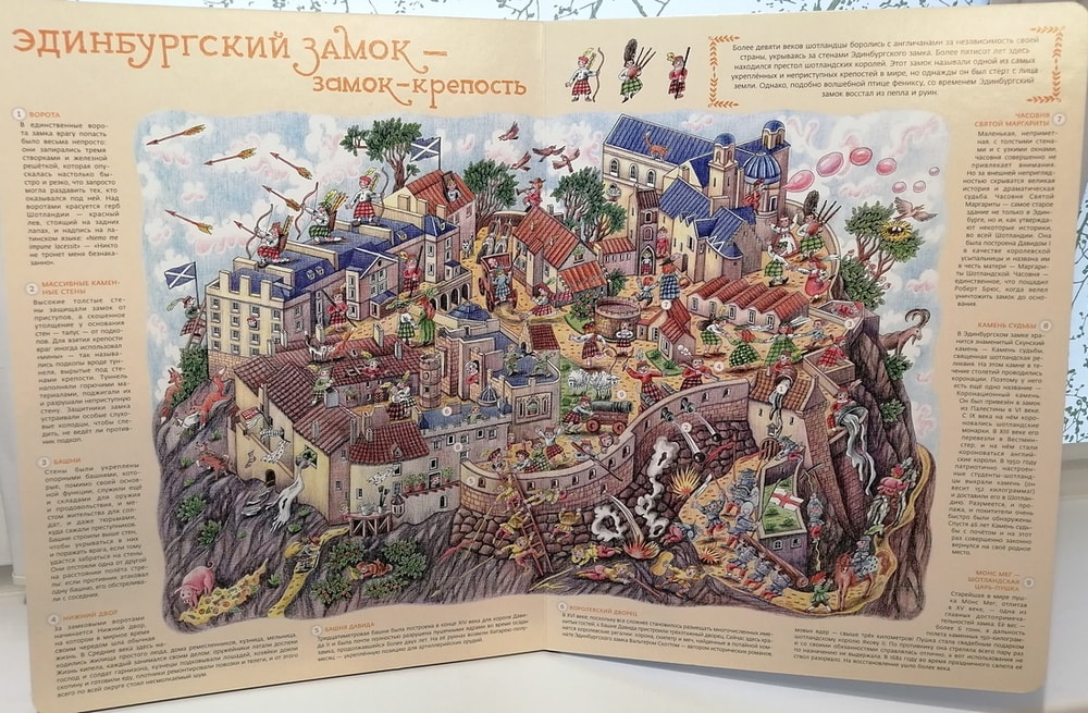 Огромная (почти формата А3) книга от ИДМ «Старинные замки». Фото обложки из интернета, на самом деле она не такая толстая, в ней 9 картонных разворотов. Когда я впервые увидела эту книгу, она показалась мне слишком сиреневой – очень много этого оттенка в рисунках.