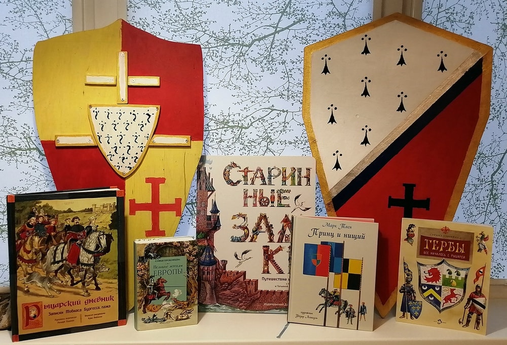 Ну как после таких книг было не сделать себе щиты с гербами. Хорошо, что рядом с дачей открылся пвз Озона, куда нам везли краску и пилки для лобзика.