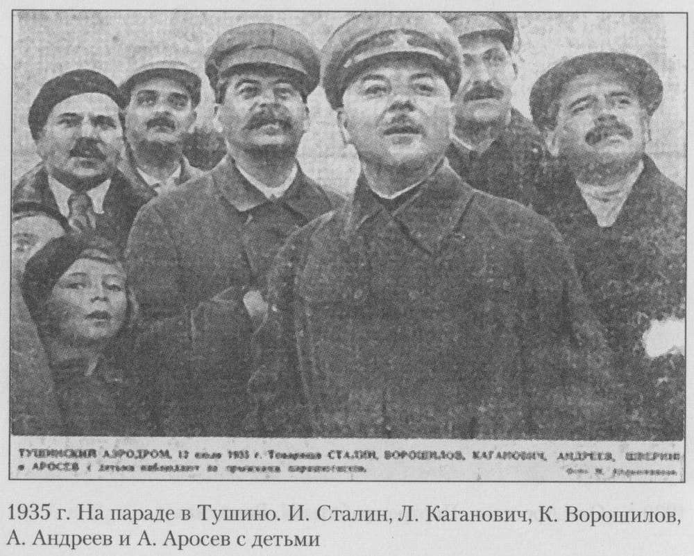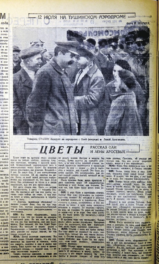 12 июля 1935 года, в День авиации, мы были на празднике на Тушинском аэродроме. Тогда еще не было никаких павильонов, никаких трибун, все просто стояли, наблюдая парад. Папа не был членом политбюро, мы скромно разместились в сторонке. Но Сталин «своим орлиным взором» углядел нас, подошел и сказал: «Как не стыдно, большие встали впереди, маленьким девочкам ничего не видно». Он взял нас за руки и поставил впереди себя. Потом спросил у меня: «Девочка, сколько тебе лет?» Я ответила: «Двадцать первого декабря исполнится десять лет». На что Иосиф Виссарионович, друг всех детей и всех народов, удивился: «Смотри, мы с тобой сверстники, я тоже родился двадцать первого декабря. Приходи, девочка, вместе праздновать будем». Я совершенно растерялась, закивала, благодарила неизвестно за что (…) Мне было приятно, что я оказалась в центре внимания, что на меня обратил внимание вождь народов. Несколько раз он просил разрешения закурить, я кивала: «Да курите, пожалуйста». Он похвалил меня: «Вот молодец, а моя девочка Светлана не разрешает мне курить». Меня удивило, что он трубку выбивает о каблук сапога. Когда спустились парашютистки с букетами цветов, огромными, почти одного роста с ними, и поднесли Сталину эти цветы, он взял самый большой букет, отдал его мне и сказал: «Возьми его за день рождения, приходи, будем вместе праздновать». Я эти цветы отвезла домой. Нас фотографировали на аэродроме, а Сталин приговаривал: «Этот снимок завтра в „Правде“ видишь, а этот в „Комсомолке“». Потом приходили и к нам домой, снова снимали меня с этим букетом, расспрашивали, но я была не очень разговорчивой, за меня говорила сестра Елена, рассказывала, как я беседовала со Сталиным. Интервью, напечатанное в «Комсомольской правде», у меня сохранилось.