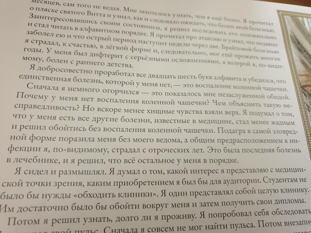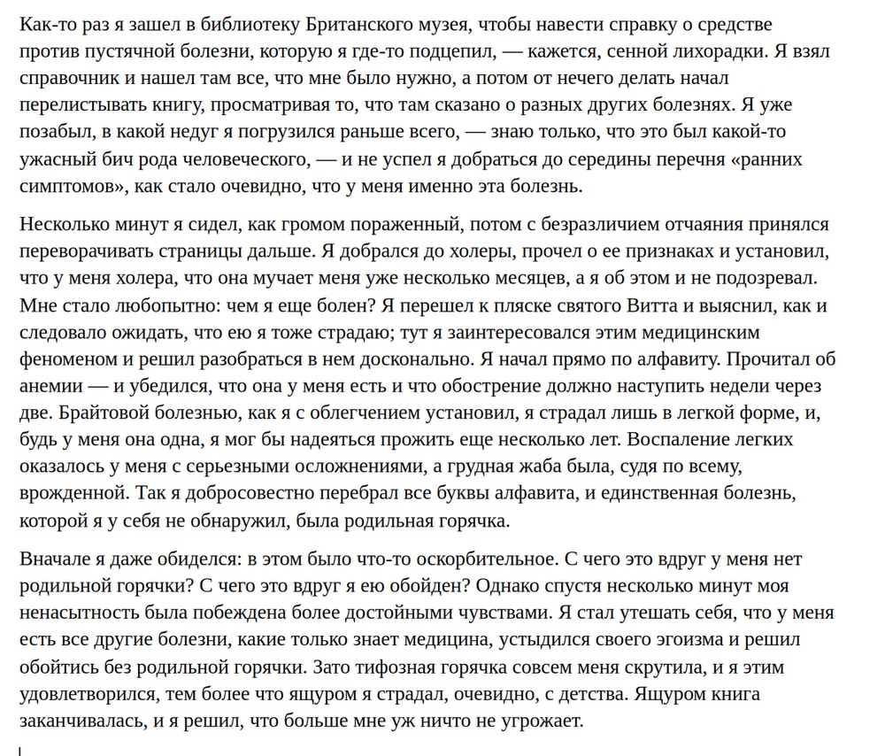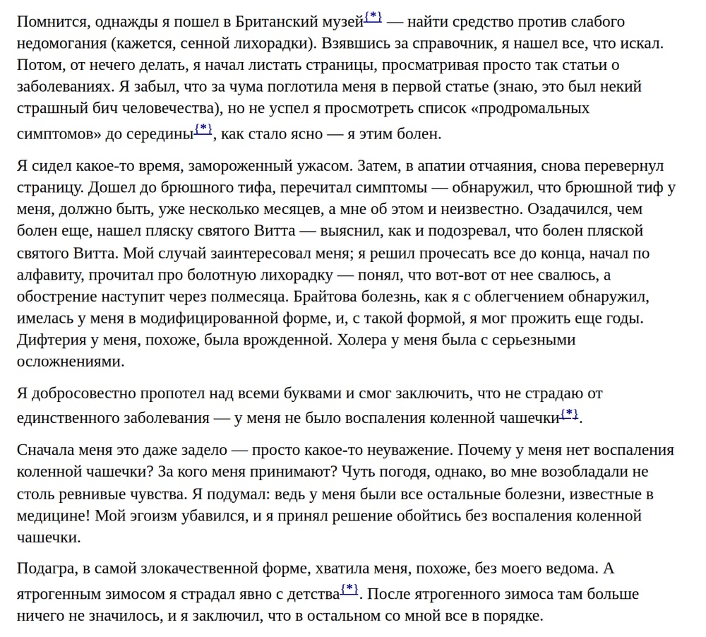 Я помню этот эпизод из книги: герой, почитав медицинскую энциклопедию, обнаружил у себя симптомы всех известных науке болезней, кроме родильной горячки.