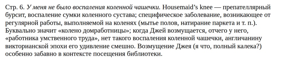 А вот как! housemaid's knee. Буквально - "колено горничной". Просторечное название того самого воспаления коленной чашечки - и мы понимаем, что у героя Джерома не могло быть этого заболевания из-за его совсем иного образа жизни. В общем, юмор утерян при медицинском термине.