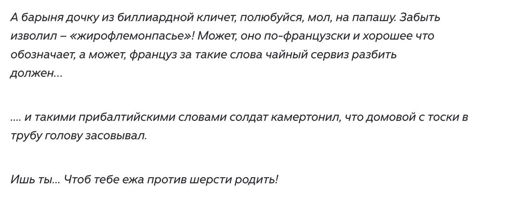 Бердыши - пищали - шрапнель... галуны - темляк - лядунка... швалня и москательная лавка... штиблеты - прюнелевые ботинки - сапоги на ранту... тальма - епанч - оплечье - поддёвка - плисовые штаны... спорынья в квашне... гарнец - шкалик - штоф кизлярки - сороковка... хвосты молоньи... нос на вздержках...