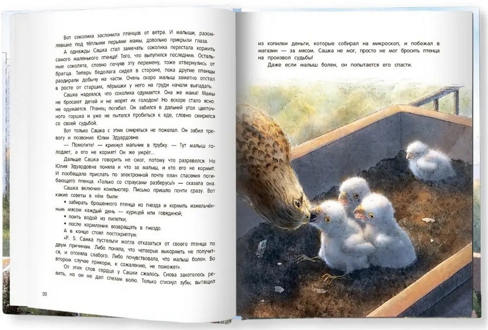 Прочитали тоже все втроем по очереди. Хорошая история о том, как однажды на балконе многоэтажки пара соколов облюбовала себе место для гнезда. И с момента откладки яиц до становления на крыло молодых соколят их жизнь стала неразрывно связана с жизнью жильцов квартиры. Книга о помощи природе, о взаимоотношениях в семье, о том, что странный одноклассник может стать другом и, конечно, о соколах. Книгу сопровождают очень приятные рисунки, как будто настоящие фотографии чуть размыты как акварель.