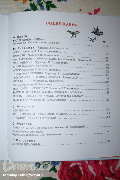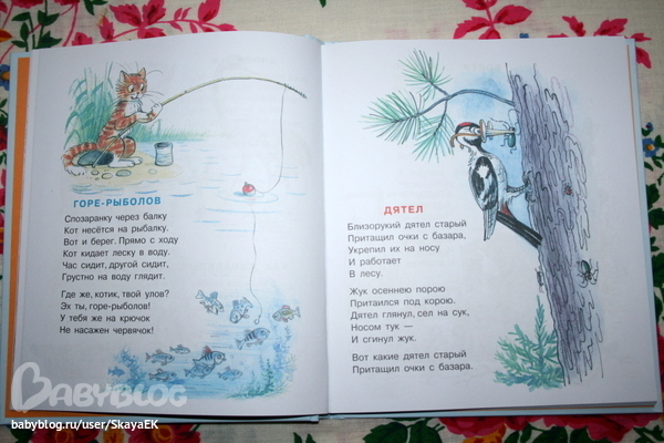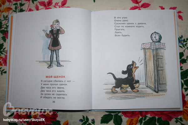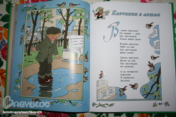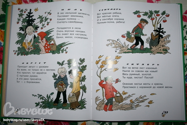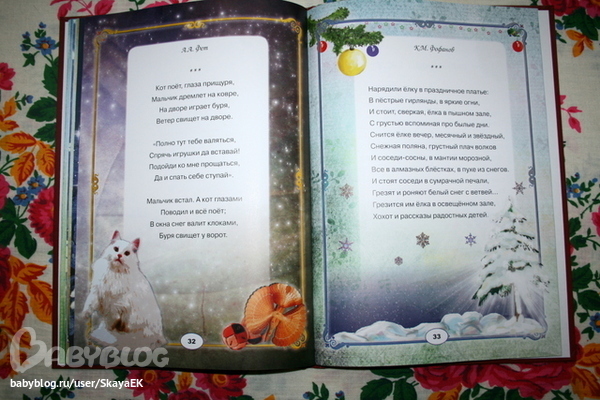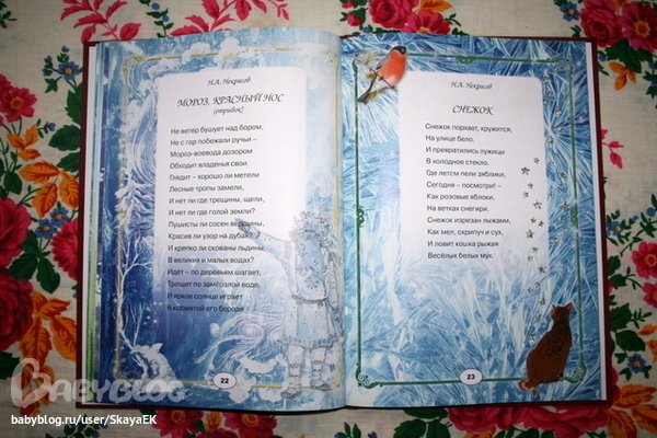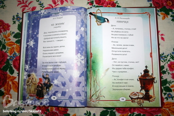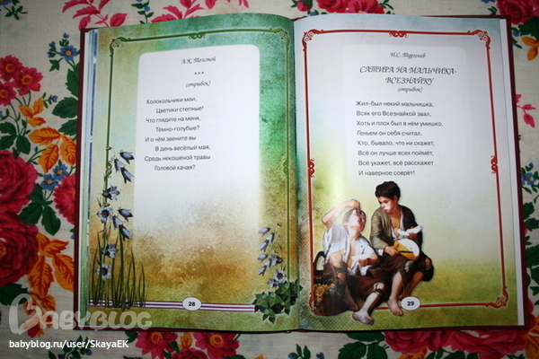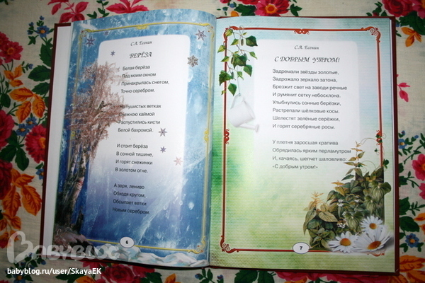 Еще когда дочка была совсем кроха, кроме песенок я читала вслух стихи. Поскольку я понимала, что скоро выбирать их буду не я, а она, то имеет смысл хотя бы сейчас почитать то, что приятно маме. Детская библитека на тот момент была очень скудная. Поэтому в ход пошла классика (Пушкин, Лермонтов, Есенин и т.д.). Через пару лет, действительно, детские стишки про кошечек, машинки, сказки про колобков, медвежат и т.п. Поскольку читаем мы много, конечно слегка надоедает (мне, конечно). Потому и обожаю этот сборник. Здесь любимая классика (Есенин, Тютчев, Фет, Некрасов, Толстой и т.д.). И далеко не все стихи можно назвать детскими, они для всех. Может поэтому в книге картинки - не рисунки, а вырезки фото. Тоже очень радует глаз.