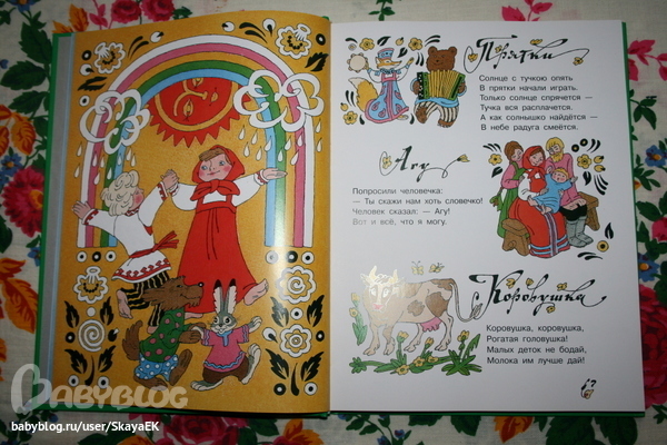 На первый взгляд в ней слишком пестрые картинки. За то их интересно рассматривать. В них очень много орнаментов и различных предметов, животных, людей. Так что кроме чтения можно искать и даже считать на картинках цветочки, птичек или еще что-то.
