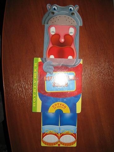 Эта книга досталась мне как подарок от Лабиринта где-то год назад. Дети очень любят, когда я им ее читаю. И хихикают, как бегемот широко открывает рот. Стихи простые, весь интерес книжки именно в том, что если потянуть бегемота за ноги, у него выезжает открытая пасть. Думаю, по фото это понятно, (фото не мои, с того же Лабиринта) Качество книги меня приятно порадовало, картон очень плотный.