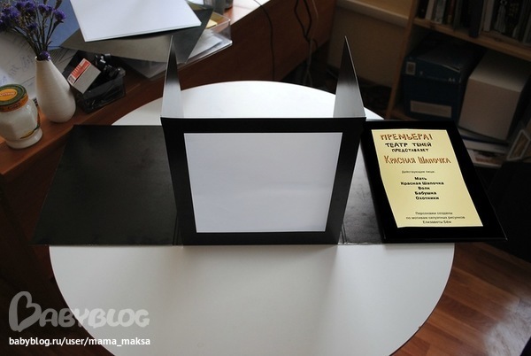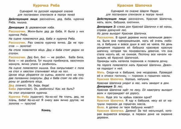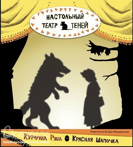 Настольный театр теней. Курочка Ряба. Красная Шапочка , судя по описанию, это книга-игра, которая может превратиться в настольный театр. В комплекте есть складная сцена театра теней, две сказки в виде пьес и набор для вырезания силуэтных изображений по мотивам работ художницы Елизаветы Бем.