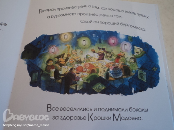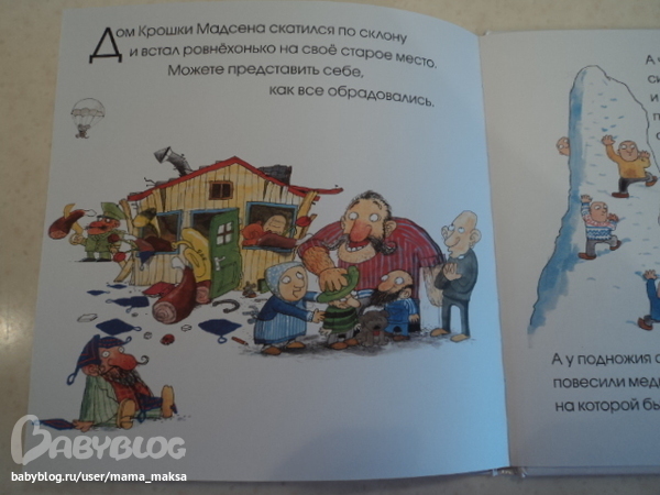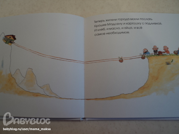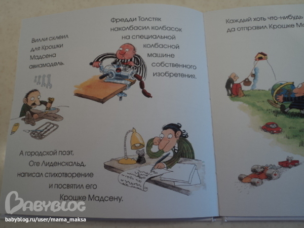 И посылал дорогому соседу, попавшему в беду, всё самое необходимое (кухонные прихватки, лошадиные подковы, новые стихи). Причем, у сына самый любимый разворот в книге как раз тот, где соседи посылают Крошке Мадсену разные полезные предметы.