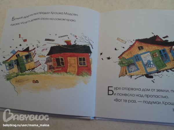 Что касается содержания, то здесь можно испытать знакомое доброе удовольствие, от того, как целый город спасал маленький домик соседа Крошки Мадсена, унесённый бурей на скалу «Костей-не-соберешь».