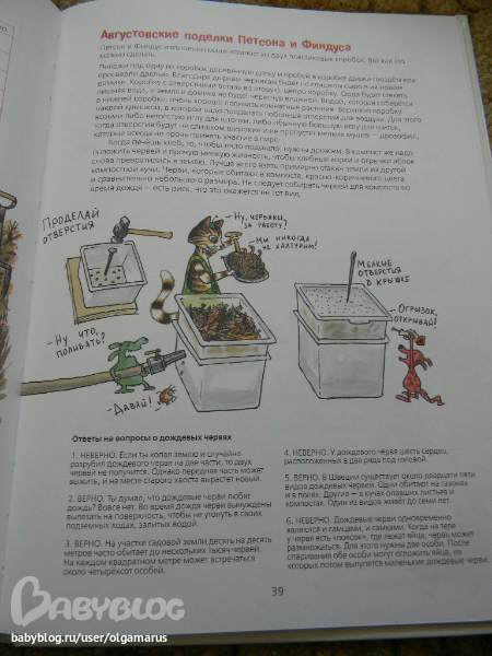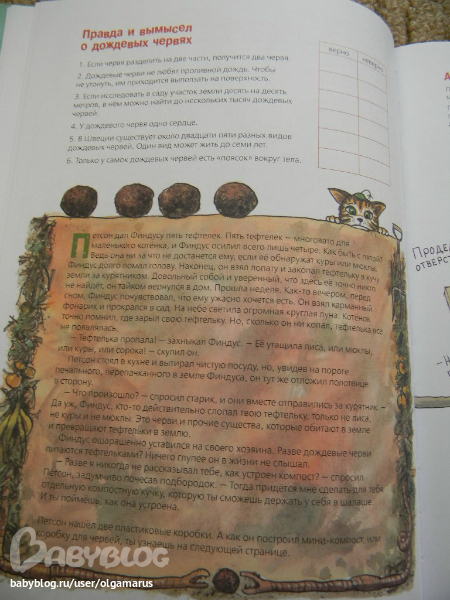 Ну тут у меня неоднозначное мнение, вроде и интересная книга ( как весело провести время), разные поделки, хотя некоторые порой сложноваты и не уверенна что заинтересуют ребенка, но есть и интересные. Но вот ловить в пруду головастиков (или лягушачую икру) с целью последующего наблюдения их превращения в лягушку я как то не готова, так же как и не готова приносить домой дождевых червей и наблюдать как они свои ходы будут в аквариуме с землей делать ну и прчуюю "симпотичную" живность)) хотя у меня растет (уже давольно любознательный сын, который стал меня уже засыпать вопросами, мама а что кушает лыбка, червей сынок, мама а что челвяк кушает и т.д...))) и чую что этого нам не избежать, пока оставлю книгу, может действительно пригодится)))