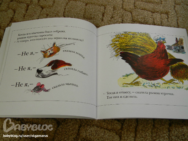 Как говорится в пословице" кто не работает тот не ест", вот собственно об этом и книга) Рыжая курочка хлопочет по хозяйству и никто не хочет ей помогать, лентяи- мышка, собачка и кошка все время отвечают не я, не я... В конце книги они конечно все осознают и исправятся)) а еще малыши узнают как пекут хлеб (по ходу книги) , что нужно вырастить пшеницу, отнести на мельницу и т.д.