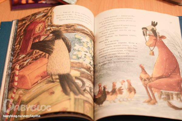 Опять же, давно смотрела на эту книгу, потому что книги про Финдуса и Петсона у нас в почете. Повеселил ворон в этой книге, ведь не часто ворон сам себе дарит подарки. Иллюстрации порадовали наличием мелких деталей, которые ребенку очень интересно рассматривать и находить. Но книга для деток после 2х 3 лет подойдет, малышам можно вкратце пересказывать написанное.