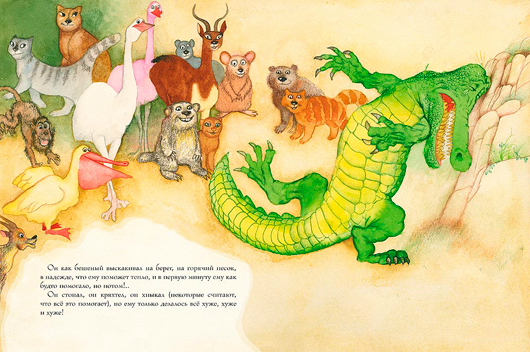Благодаря художнику Геннадию Калиновскому зверей, птиц и рыб можно не только услышать, но и увидеть. Посочувствовать крокодилу, страдающему от зубной боли. Посмеяться над корчащими рожицы мартышками. Восхититься смелостью птички, запрыгивающей в крокодилью пасть.