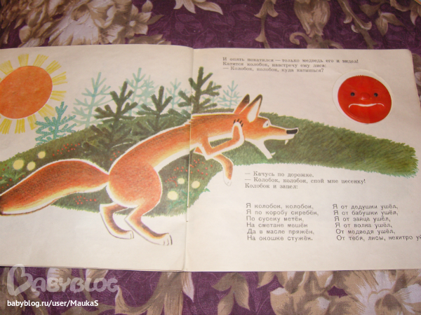 7. Вот он наш Колобок. Любит его дочка и все тут. Книжка странная. Рисунки квадратные, угловатые. Сам колобок пластиковыйи сильно оранжевого цвета... Вырубка.