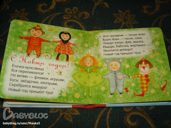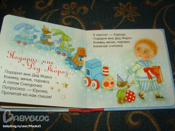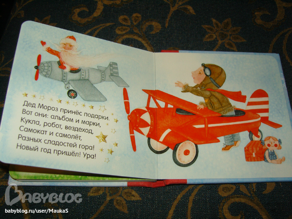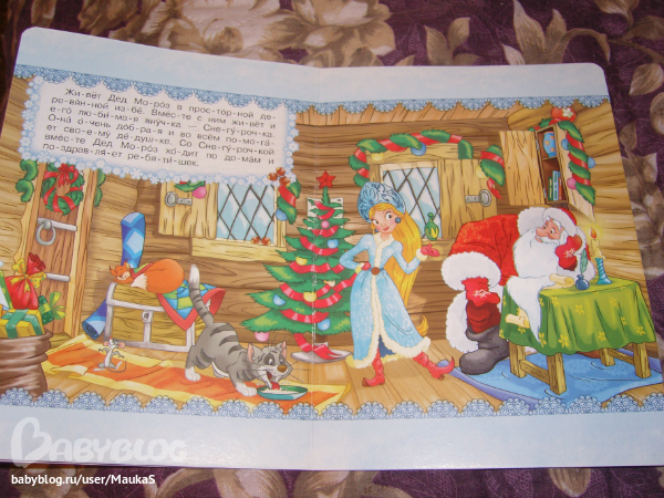 В книжке на каждой странице Дед Мороз - что не может не радовать мою доченьку) Мы по нему изучаем шубу, бороду и прочие атрибуты ДМ)
