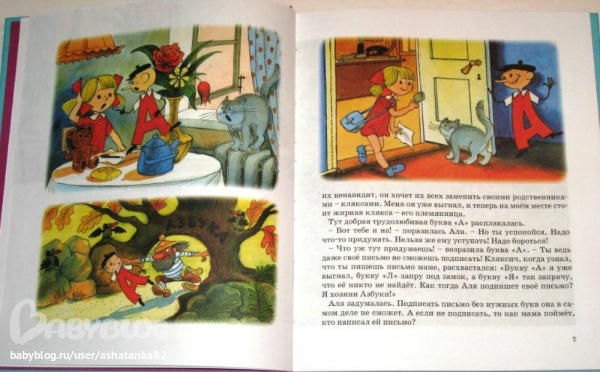 Каждая буква имеет свой характер, свои привычки и детям это очень нравится. Прекрасные иллюстрации-яркие, красочные, соответствующие тексту. Чистой воды обучалка. В ней есть все, что нужно: и захватывающий сюжет, и обучение буквам, и задания разного плана, и "зарядка для язычка", скороговорки. Интересно и полезно.