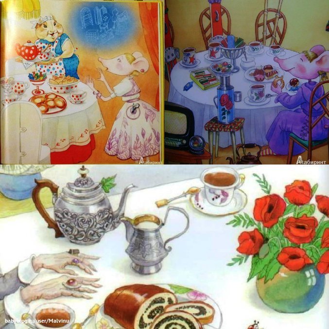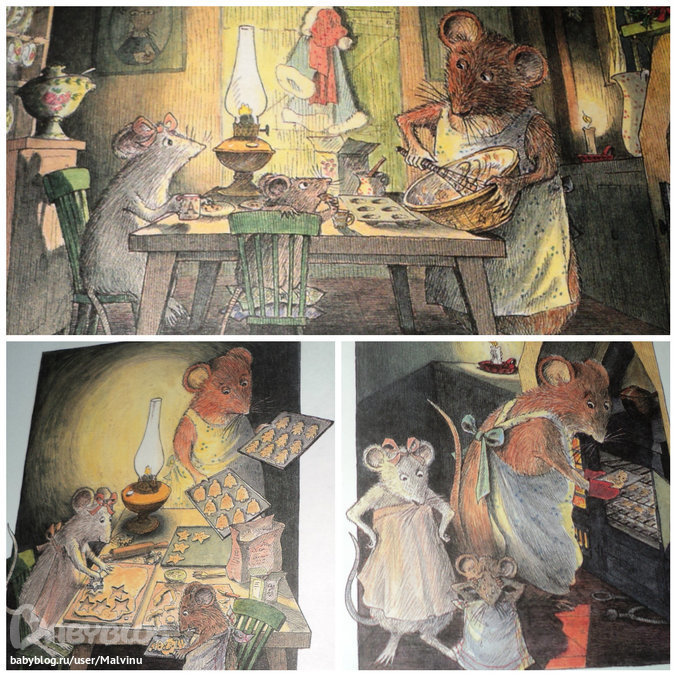 От трех до пятиОбратила внимание, что в последнее время мою девчоночку очень заинтересовала тема еды в книгах: приготовление, накрытие на стол, ну и т.д. Например в "Анжелине-балерине" нравится рассказ о том, как мышки пекли печенья на Рождество. Всегда долго рассматривает эти картинки и комментирует :