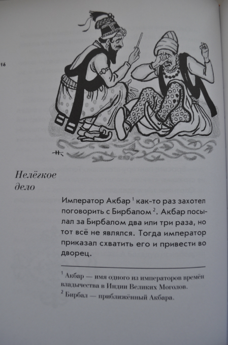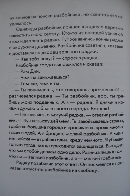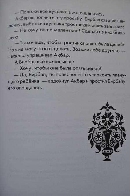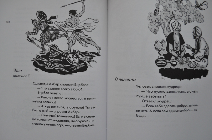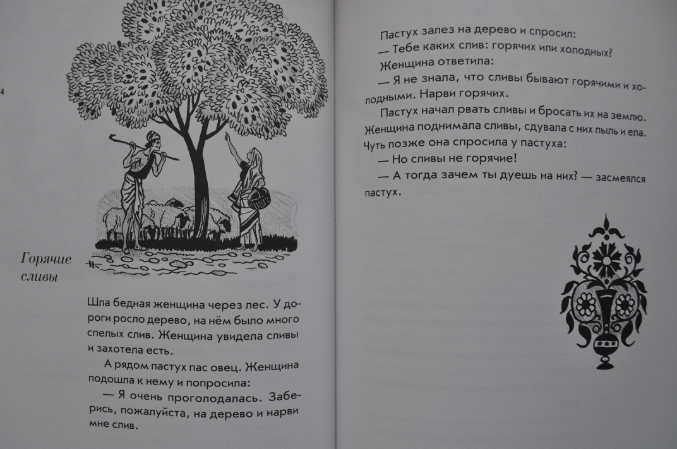 Я в уме их называю даже не сказками, а притчами о мудрости, о торжестве правды над ложью, хитрости над коварством, природной смекалке, терпении. Может, именно благодаря тому, что сказки похожи на притчи, книга может стать настольной, как любимый сборник стихов - открываешь на любой странице и читаешь о простых и вечных истинах. Сказки по объему разные есть на 5 страниц, а есть на половину странички. Не буду фотографировать я все картинки, по черно-белой в начале каждой сказки и 6 цветных на мелованных вклейках. Не много, но достаточно, тем более на тот детский возраст, какому адресована книга 10+, но думаю младшим школьникам тоже подойдет.