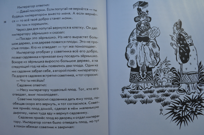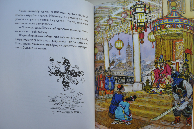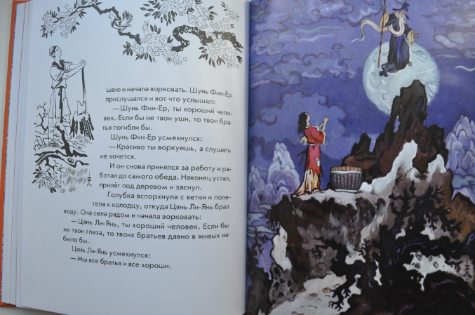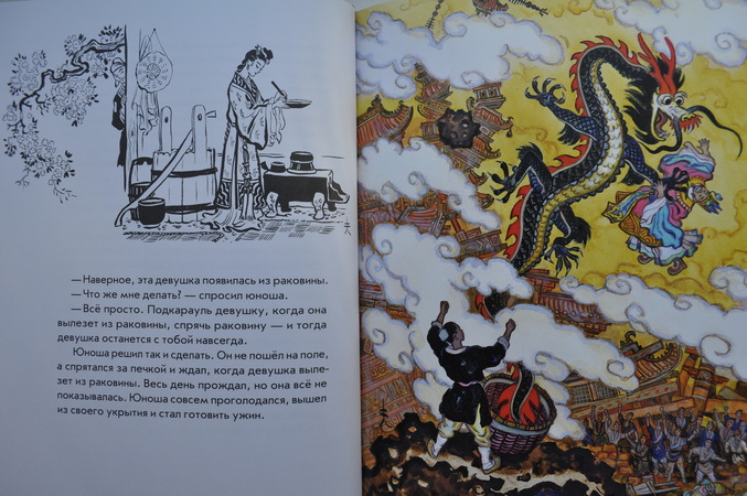 Индийским сказкам повезло меньше. В отличие от них, Кочергин щедро одарил Сказки Китая своими волшебными иллюстрациями! Разворотов без картинок по пальцам пересчитать. Для меня иллюстрации Николая Михайловича к восточным сказкам самые идеальные - стоит посмотреть на отдельные от текста иллюстрации и сразу видно, к сказкам какого народа она относится - к японскому, китайскому или индийскому, видно. что Художник со всей тщательностью подходил к изучению быта, костюма, природы народов стран Азии, прочувствовал самобытность каждой культуры. От этого рассматривать его иллюстрации еще интереснее.