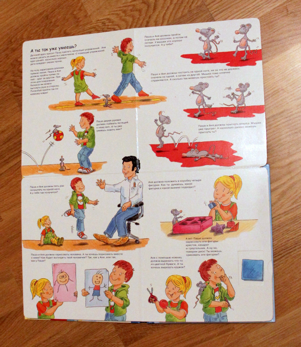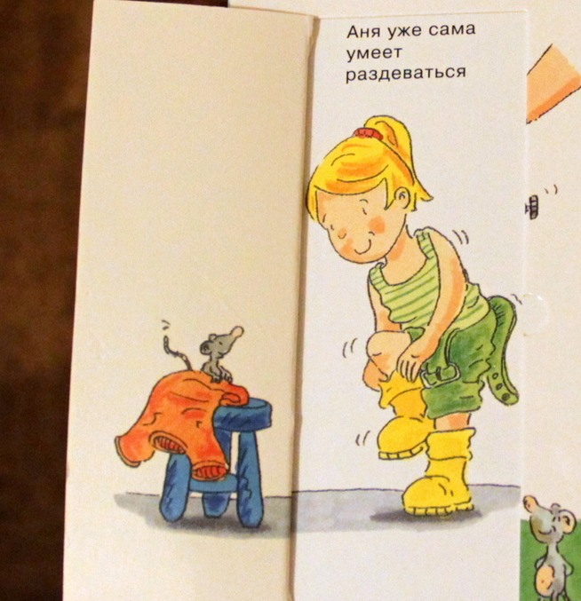 Этот разворот (выше) ооочень заинтересовал Фельку. Сначала он много раз посмотрел, как Аня раздевается, и обсудил со мной, что именно она снимает :) Позже, когда стали переодеваться ко сну, при упоминании Ани с гораздо большей охотой, чем обычно, возился сам со своей одеждой. Потом мы изображали, как смотрим друг другу в ушки. Изучили рты с зубами и языком, Фелька потренировался открывать рот и говорить "аааа".