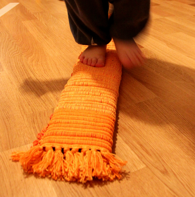 Потом нам прочитали, как дети ходили по линии, и сделали себе тоже такую - сначала наклеили на пол строительный скотч и Фелька потренировался на нём, а потом я решила попробовать что-нибудь более выпуклое и свернула купленный сегодня для прихожей хлопковый коврик. Получилось так здорово, что, я чувствую, коврик до прихожей не дойдёт.