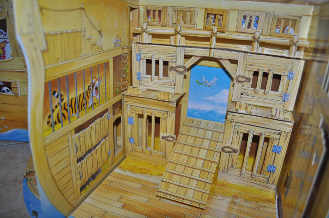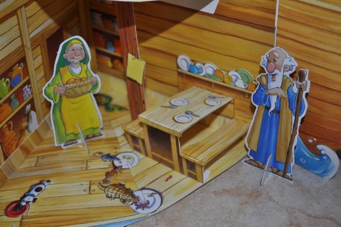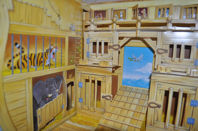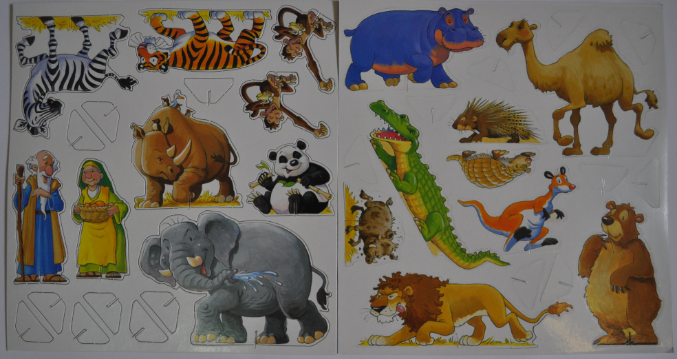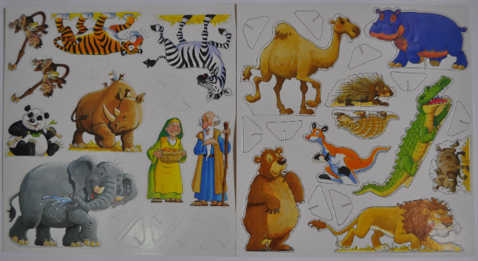 А в самой понарамке есть тайничок, из которого достаются два картонных листа в фигурками животных и Ноя с супругой, с подставочками для них.