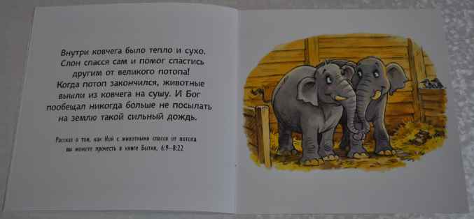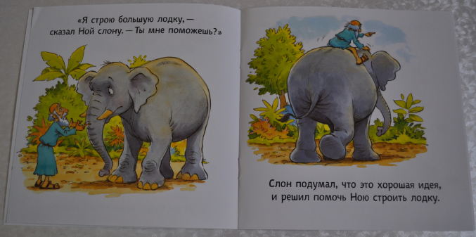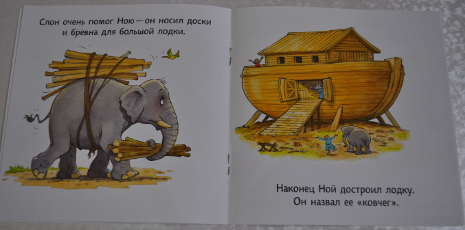 А помимо фигурок в тайничке нас ждет еще один сюрприз - книжечка с коротенькой историей о слоне, который помог Ною построить ковчег. Текст прям для самых-самых маленьких.