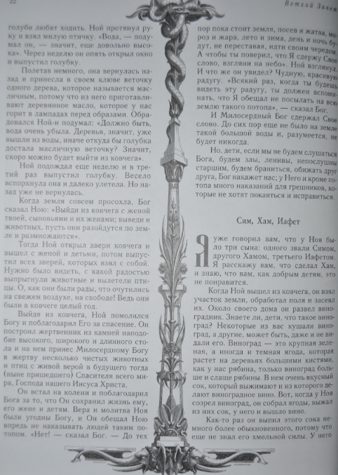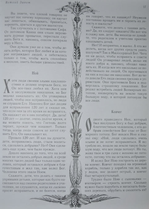 Само повествование мне очень понравилось. Автор ведет диалог с ребенком, ласково обращается, задает вопросы. Если читать взрослую Библию, то там до сокрытых смыслов надо доходить самому, что тот или иной человек имел ввиду под этими словами, какой смысл тех или иных поступков, чему хотел научить Бог, наказывая, или почему простил грехи и т.д. Над Библией надо думать. Так вот, в этой книге автор раскрывает ребенку, что скрывается за теми или иными словами, поступками, действиями. Почему Бог устроил всемирный потоп? Зачем послал Сына Своего на землю? Цитирую "Как! У Бога есть Сын? Вот сейчас я и расскажу вам о Боге Отце и Сыне Божьем. Только будьте внимательны, дети, - это очень трудно понять". Язык повествования современный, нет устаревших слов, а если они употребляются, то автор в скобках их расшифровывает.