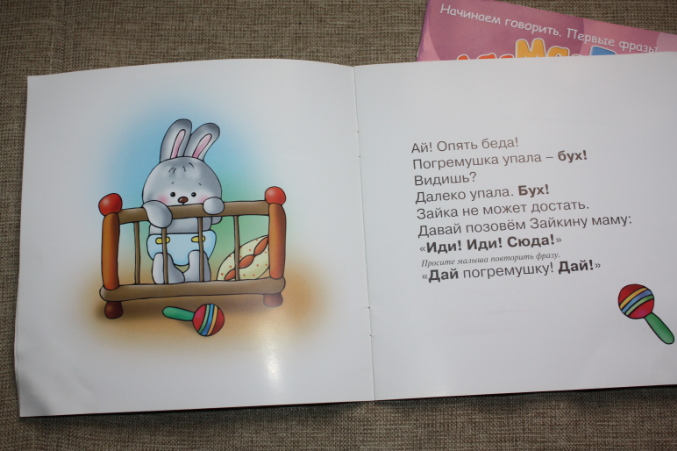 внутри вот такого плана(картинка на одной странице, слова на другой. Доча все показываеет, жалеет зайку, хочет дать ему другую погремушку))