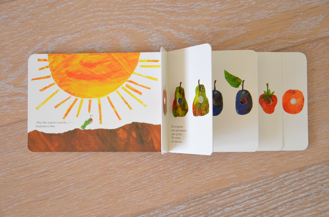Очень голодная гусеница, история превращения гусеницы в бабочку после поглощения продуктов. Дочка с удовольствием ковыряет дырочки, а на последней страничке мы придумали махать последним листочком, имитируя полет бабочки)) дочка просто пищит от восторга!!