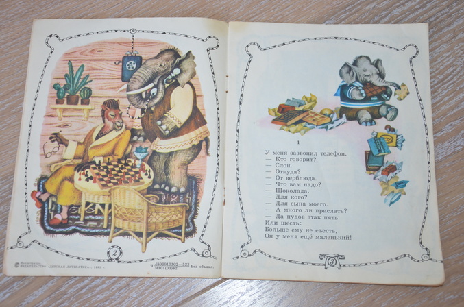 Начну с букинистического издания всем известного Телефона. Большую книжку Чуковского из предыдущего поста мы всё еще любим, но вот эта тоненькая потрепаная книжечка моей дочери нравится намного больше! Неяркие иллюстрации Винокура завораживают! Я думала, что я просто ностальгирую... ан нет, дочка оценила её по достоинству!