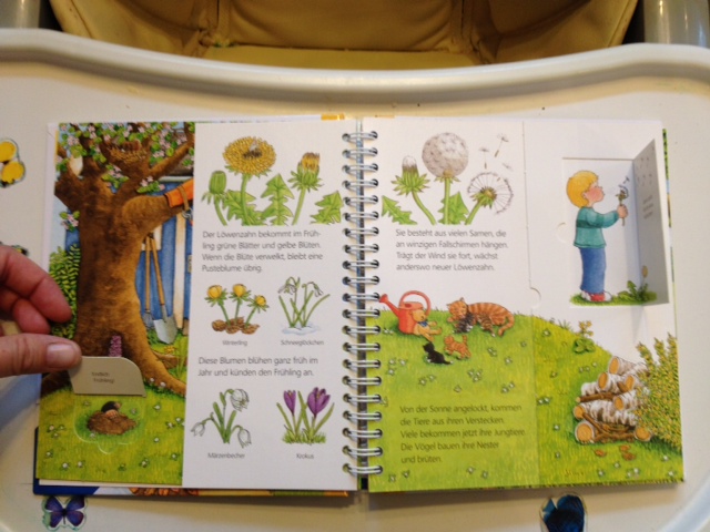 Эта книга большого формата, из серии для детей постарше. Информация представлена уже на более "взрослом" уровне. Но нас не смущает)) С наступлением весны эта книжка всегда где-то рядом. Смотрим на улице (мы за городом живем) как тает снег, появляются росточки, листочки, цветочки. Как начинают летать бабочки и пчелы. Канава со снегом превращается в ручеек. И, думаю, до следующей зимы будем обращаться к ней не раз. Показано, как растет дерево. Что растения и насекомые бывают колючими. Как растут разные овощи, ягоды (что-то под землей, что-то на кустах и т.п.). Как за садом надо ухаживать. Для чего нужны насекомые. Как размножаются растения. Что происходит в саду ночью. Показан переход зимы в весну. Картинки очень наглядные. В общем, для нас - однозначно полезная книга))