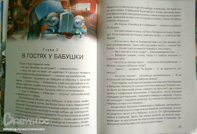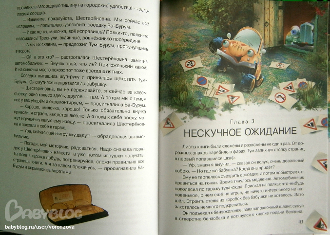 Гостюя у бабушки Тум учит знаки, правила дорожного движения. Бабуля разговаривает с внучком очень мило, можно сказать "усюсюкается", для нее он как и прежде малыш, поэтому в тексте встречаются слова типа " мой бамперичек", "фарочка моя", "свечечка моя" )))