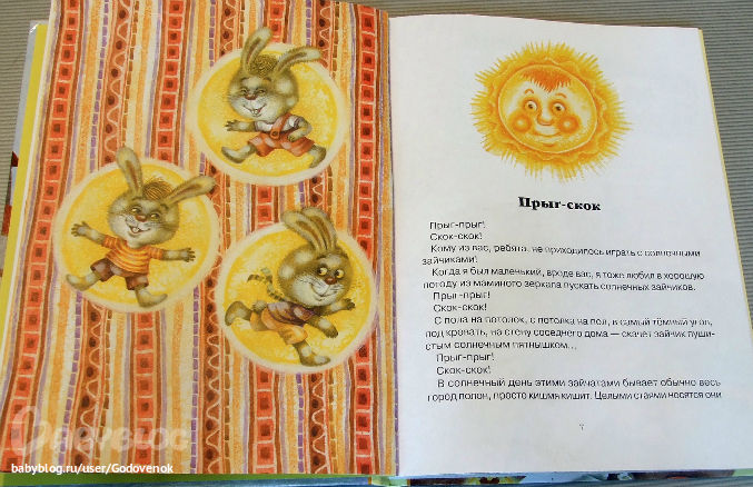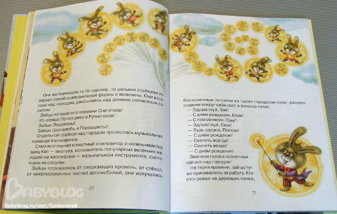 Достала я эту книгу в конце марта, начале апреля, т.к. начинается книга с мартовской работы солнечных зайчиков. Мне хотелось, чтобы дети читали и обращали внимание на то, что сейчас происходит на улице. В книге описано как зайчики распаковывают лужи (а зима их за ночь опять сковывает льдом), как отогревают почки, помогают снегу растаять и т.п.
