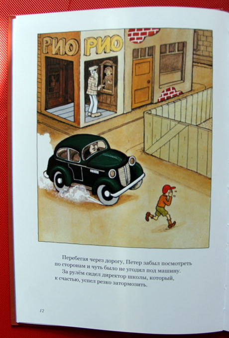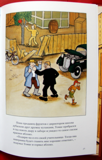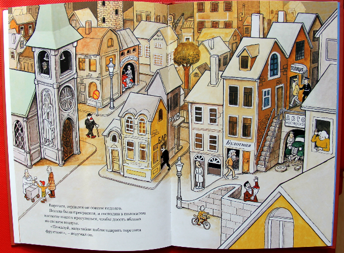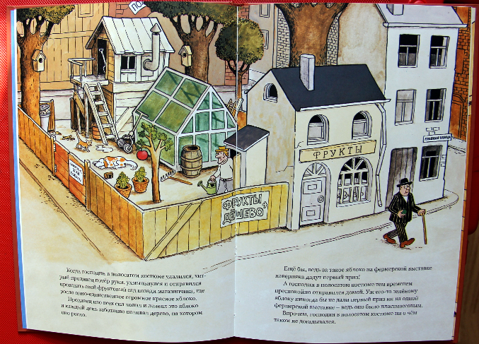 А вы видите на картинке сверху преступника? А на картинке снизу, когда всё уже закончилось и вкусное яблоко волшебным образом попало к славному дяденьке-покупателю? А машину директора школы? Ну и обиженный мальчик там есть, и пожарные, которые тоже поучаствовали в развитии событий (в книге 32 страницы).