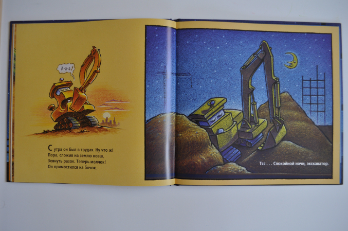Экскаватор спать совсем не хочет, "ну еще одну ямку перед сном?!" Так знакомо - Мам, еще одна стопочка книг, и я лягу спать, чесслово!