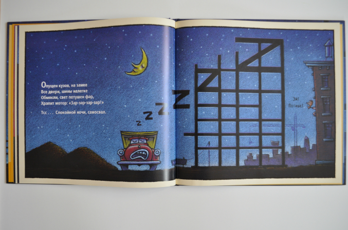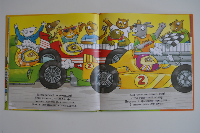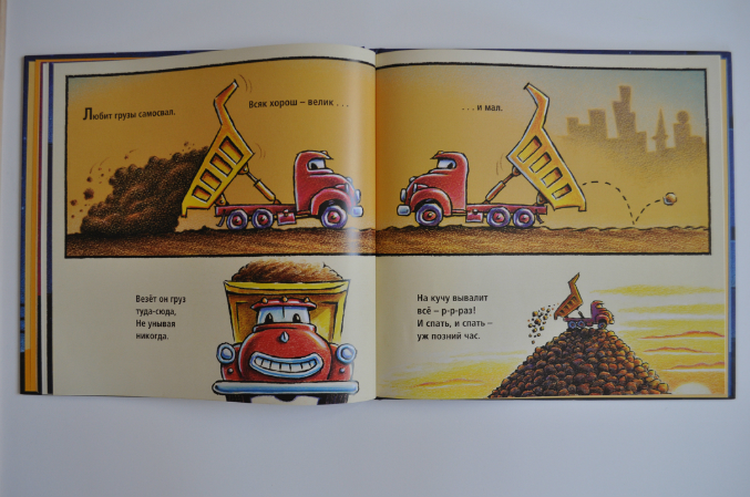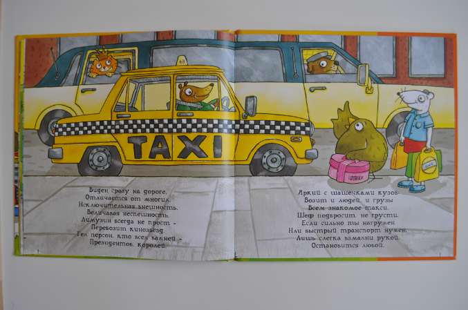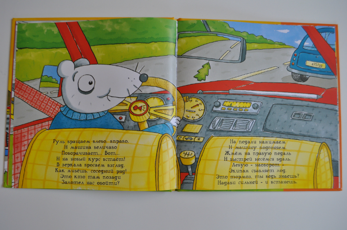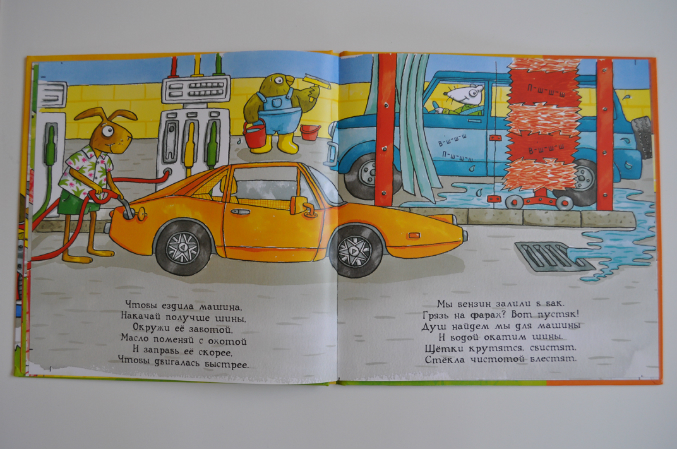 В книге рассказывается о видах легковых автомобилей, как они устроены (даже есть упоминание о полноприводных автомобилях), как за ними ухаживать, о светофорах, пробках, полицейских. Текст интересный. Не скажу, что стих шедевральный, но для такой книги весьма неплох.