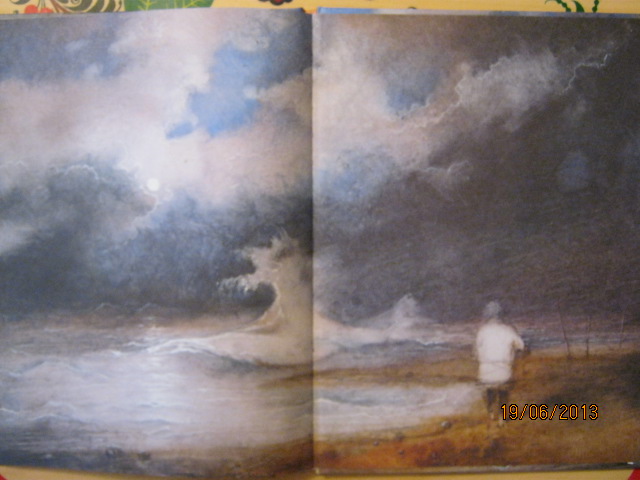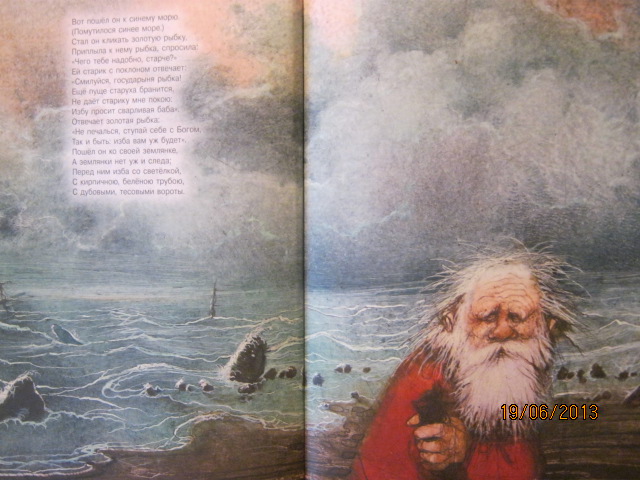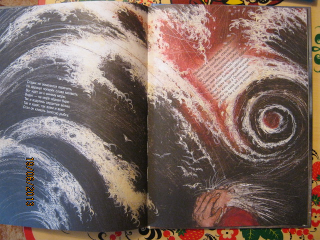 Очень мне понравилось, как художник нарисовал море и его трансформацию из спокойного в бурное. Надеюсь, на фотках это тоже видно. И еще есть развороты на каждое новое пожелание старухи - тут и корыто, и изба, и дворец, и даже трон морской царицы. Тоже очень интересно нарисовано.