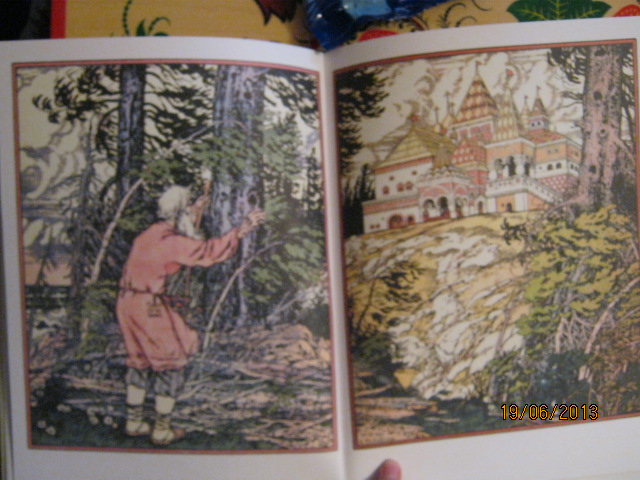И еще один минус (не очень существенный для меня) - текст местами на очень черном фоне, но это издержки того, что рисунки даны на весь разворот. А рисунки очень темные.