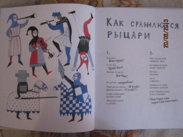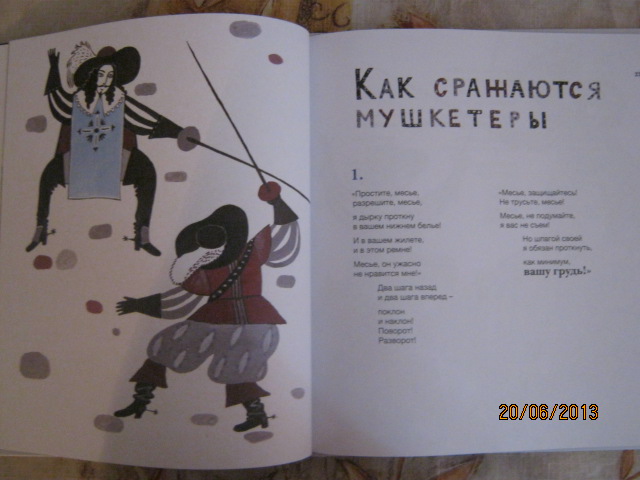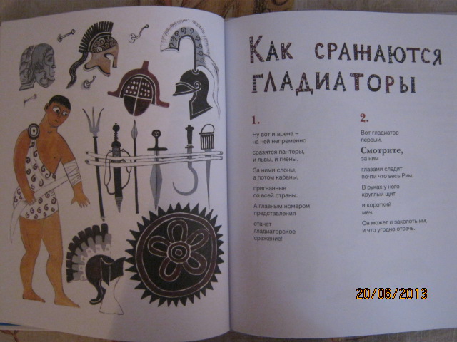Для пущей выразительности междометия выделены шрифтом и расположены вкривь и вкось. Стихи складные — бодрые и простые. Рыцари, пираты, мушкетёры, гладиаторы, самураи и ковбои вполне соответствуют детским представлениям о том, какими им следует быть. Самурай самураю кричит: "Банзай!" Пиратский попугай: "Пиастры! Пиастры!" Мушкетёрские шпаги встречаются: "Вжик-перевжик!" Древнеримская мама надеется, что сын будет легионером, а тот мечтает стать гладиатором. Всё как всегда.