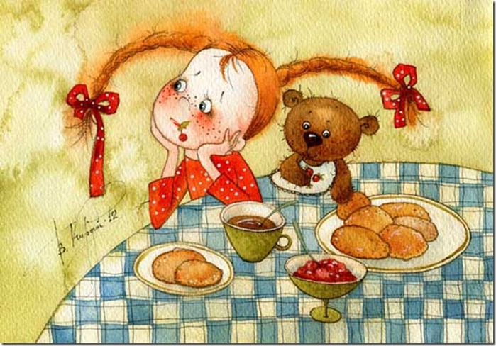 Дети, животные, цветы, ангелы и птицы, - детские картинки Виктории пропитаны добротой, нежностью и любовью. Не зря ведь она иллюстрирует сказки для детей, а для взрослых - истории о любви. Кстати, поговаривают, что в роддоме малышка Вика чуть не съела карандаш, который выхватила из руки у доктора, а в детсаду ее никогда не ставили в угол, чтобы уберечь казенные обои от "наскальных рисунков" этой непоседы. Поэтому неудивительно, что персонажи Виктории - такие же энергичные, задорные и веселые, как и она сама, вот вам и ответ на вопрос, почему так хочется смеяться и улыбаться, рассматривая ее акварели.