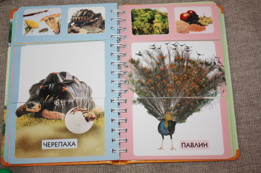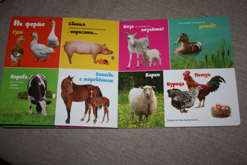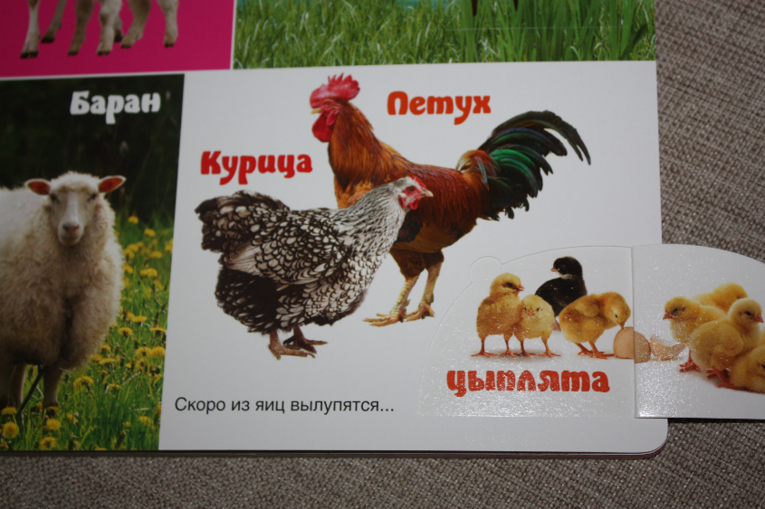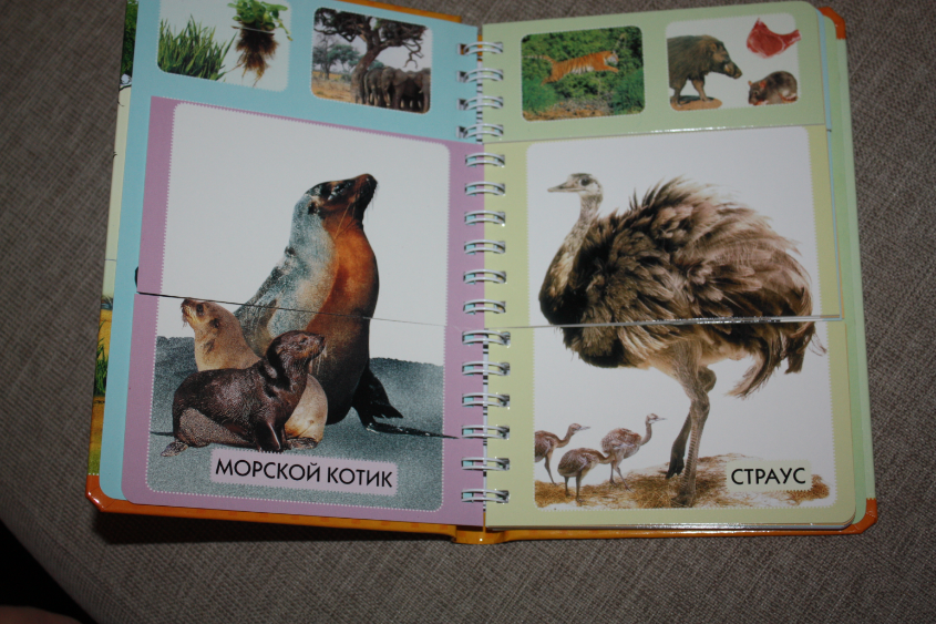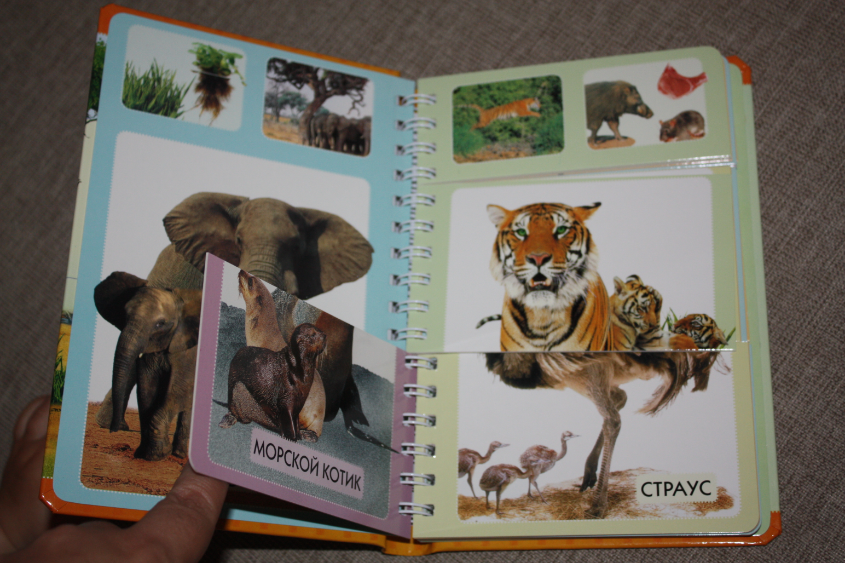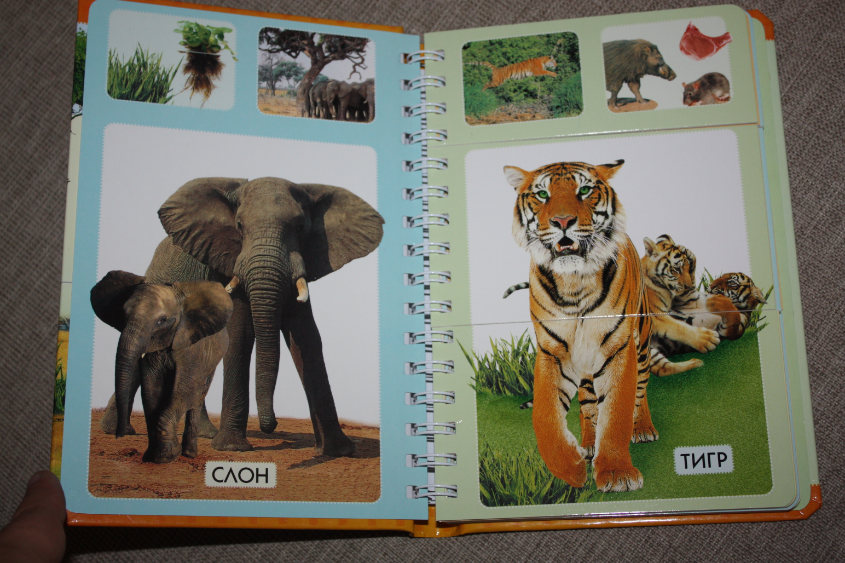 Сто слов о животных - книжка просто потрясающей яркости, живые, четкие, большие фотографии!!! Есть столь любимые малышами окошки :) Вот например