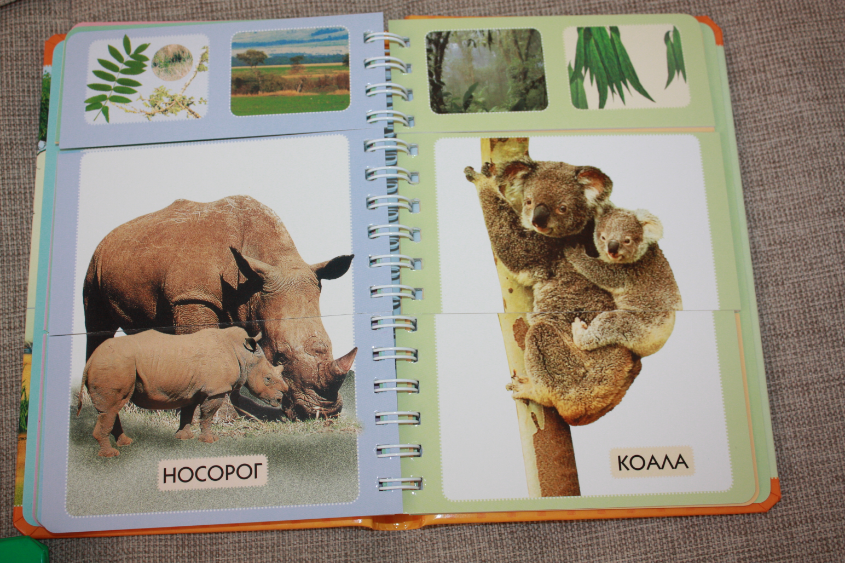 Несколько разворотов. Сделаны в виде половинок, надо "собрать животное" :) Картинки тоже замечательные! Вверху над фото животного- место обитания и то, чем питается.