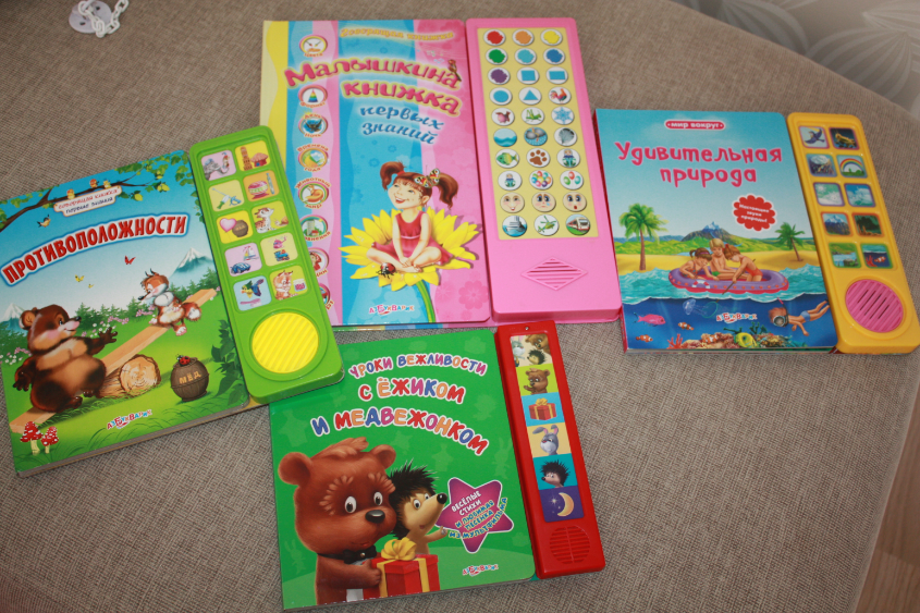 Музыкальные книжки.. Впечатления неоднозначные. Дочка не привыкла к ним, и иногда пугается)) Картинки в стиле Азбукварика, яркие)