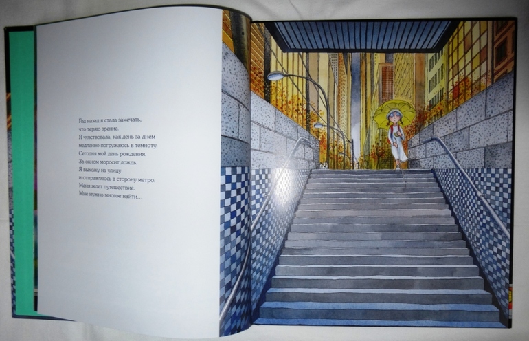 «Год назад я стала замечать, что теряю зрение. Я чувствовала, как день за днем медленно погружаюсь в темноту. Сегодня мой день рождения. За окном моросит дождь. Я выхожу на улицу и отправляюсь в сторону метро. Меня ждет путешествие. Мне нужно многое найти».
