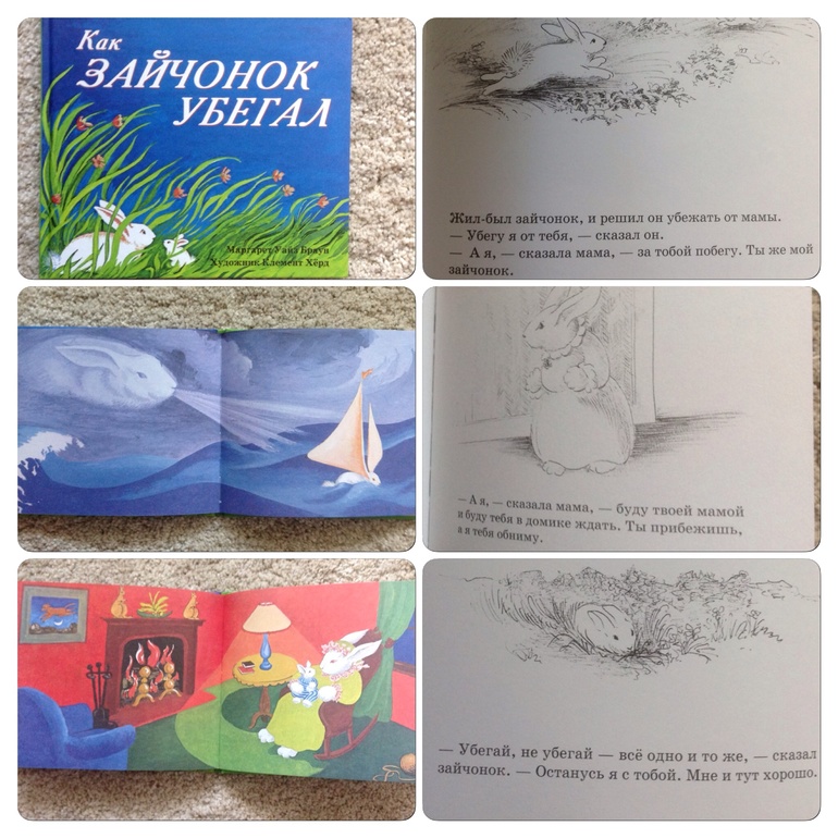 Приобрела эту книгу в воспитательных целях после того, как Володя взял моду убегать от меня на улице! Причем так быстро, что мне приходилось включать третью скорость! Книга небольшого формата, очень любим читать ее перед сном. Она такая уютная, пропитана материнской любовью. Володя слушает с замиранием сердца. Читала где-то негативную рецензию на эту книгу, которая заключалась в том, что материнская любовь описана неестественно - она удушающая, не дающая свободы, навязывается агрессивно, и у зайчонка не остается выбора, как вернуться к маме. Но у меня такого впечатления не создалось, наоборот, книга о том, что мама будет всегда рядом, что бы ни случилось и что бы ни взбрело в голову зайчонку. А последние строки кажутся наиболее важными: зайчонок сам делает вывод , что убегать не нужно, с мамой ведь так хорошо.