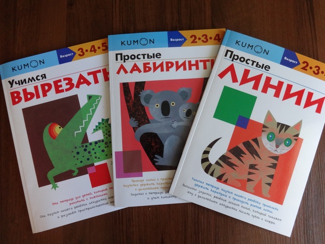 Второй у нас появилась тетрадь "Простые линии". В общем-то, возраст на ней указан - с 2-х лет, но я купила для дочки (на тот момент ей было больше 3 с половиной), т.к. с ровными линиями у нас проблема (и до сих пор). Скажу, что обычные тетради для тренировки руки за 30-40-50 рублей ничем не хуже (а с учетом цены и лучше), но раз уж я купила "Кумон", то занимаемся и по ней. Тетрадь я превратила в многоразовую - разделила на листы и вставила часть из них в файлы (периодически меняю). Дочка проводит дорожки фломастером, след от которого легко стереть. Когда картинка начинает надоедать, я вынимаю ее из файла, дочка проводит линии карандашом. Не скажу, что тут виден значительный прогресс, как с предыдущей тетрадью. Какие-то определенные успехи есть, но они не так заметны, да и используем мы и другие пособия. Так что не назову эту тетрадь обязательной к покупке. Но справедливости ради замечу, что задания интересные, линии порой очень замысловатые, и дочке эти картинки нравятся.
